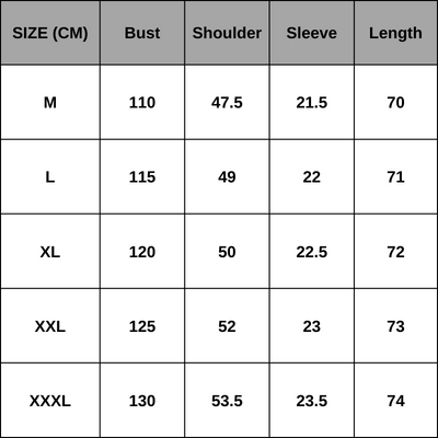 Grootte Borstomtrek Schouderbreedte Mouwlengte Totale lengte