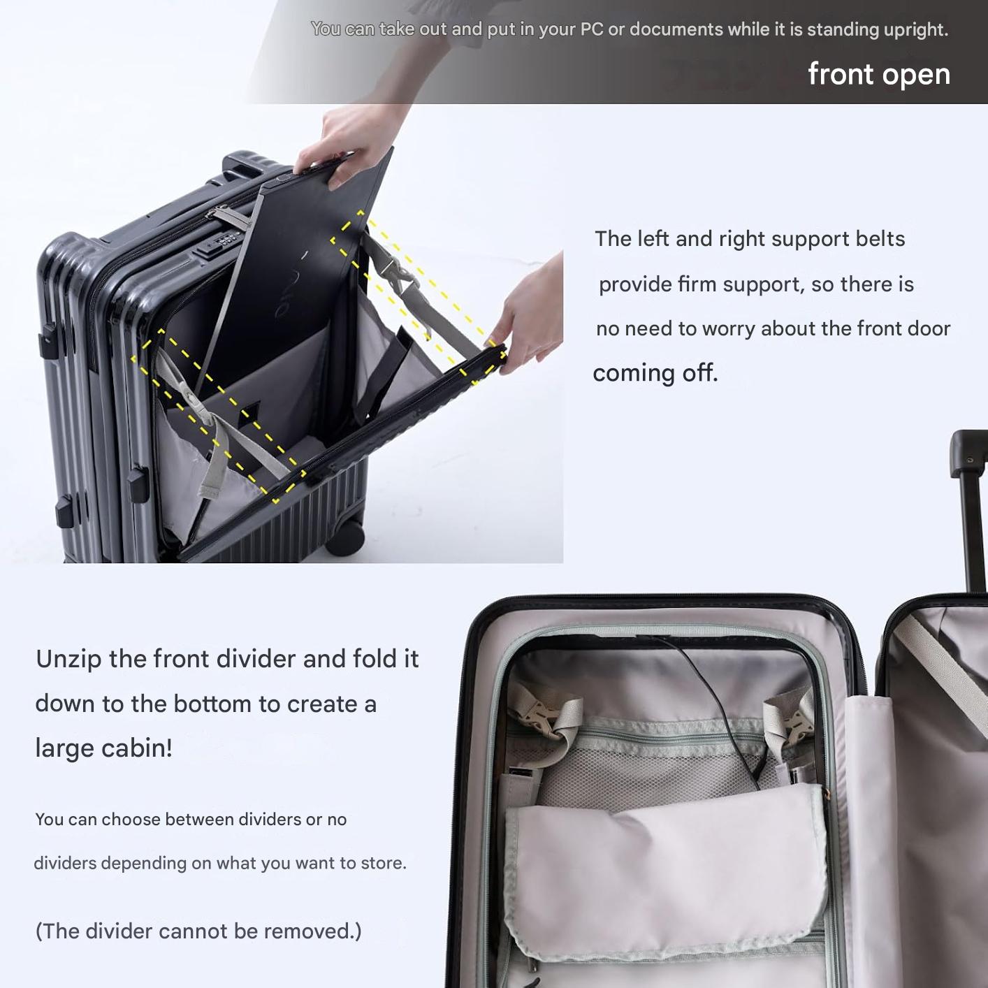 Deze koffer met vooropening maakt het eenvoudig om je spullen te bereiken terwijl je staat, wat reizen handiger maakt. Met een capaciteit van 35L is het perfect voor een verblijf van 2–3 nachten en beschikt het over een speciale pocket voor laptops of documenten. De stevige ABS+PC behuizing is lichtgewicht maar duurzaam, met soepele ritsen en een glanzende afwerking voor extra veerkracht. Voorzien van een USB-oplaadpoort, bekerhouder, tas haak en gaasorganiser, houdt het essentiële spullen binnen handbereik. Vervangbare wieltjes en vergrendelbare wielen zorgen voor extra betrouwbaarheid tijdens het reizen.