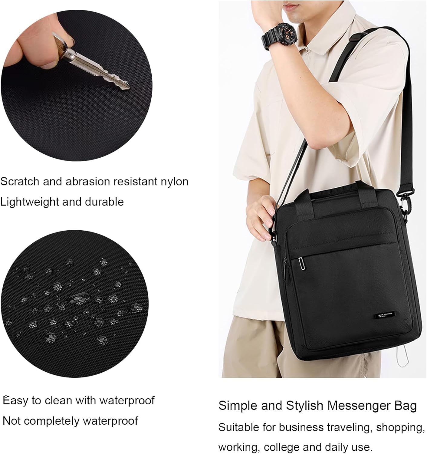 Deze schoudertas is ontworpen voor mannen die betrouwbare opslag nodig hebben zonder extra gewicht. Gemaakt van duurzaam nylonweefsel, is het lichtgewicht, waterdicht en gemakkelijk schoon te maken. Het grote hoofdcompartiment past A4-documenten en een 14" laptop, terwijl meerdere zakken kleinere benodigdheden georganiseerd houden. Met een verstelbare schouderband, bovenhandgreep, en trolleysleeve biedt het veelzijdige draagopties voor op kantoor, tijdens de woon-werkverkeer of op reis.