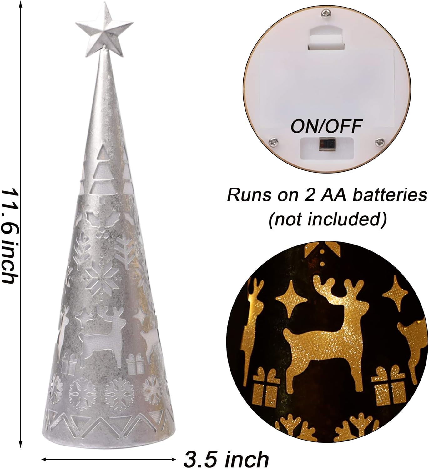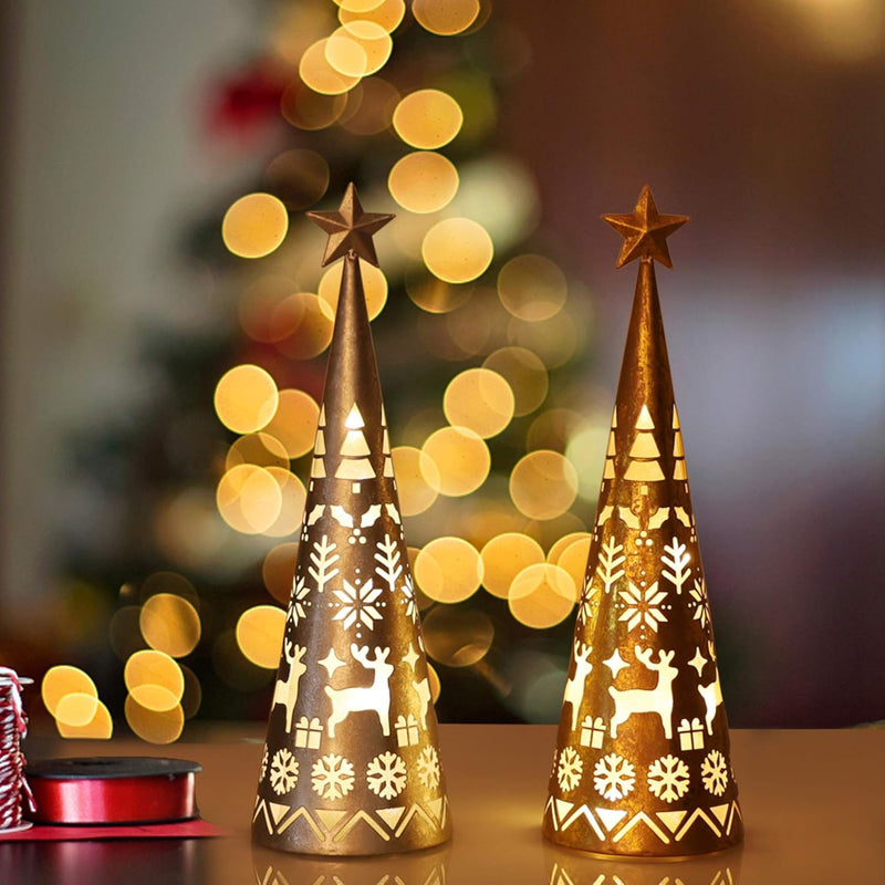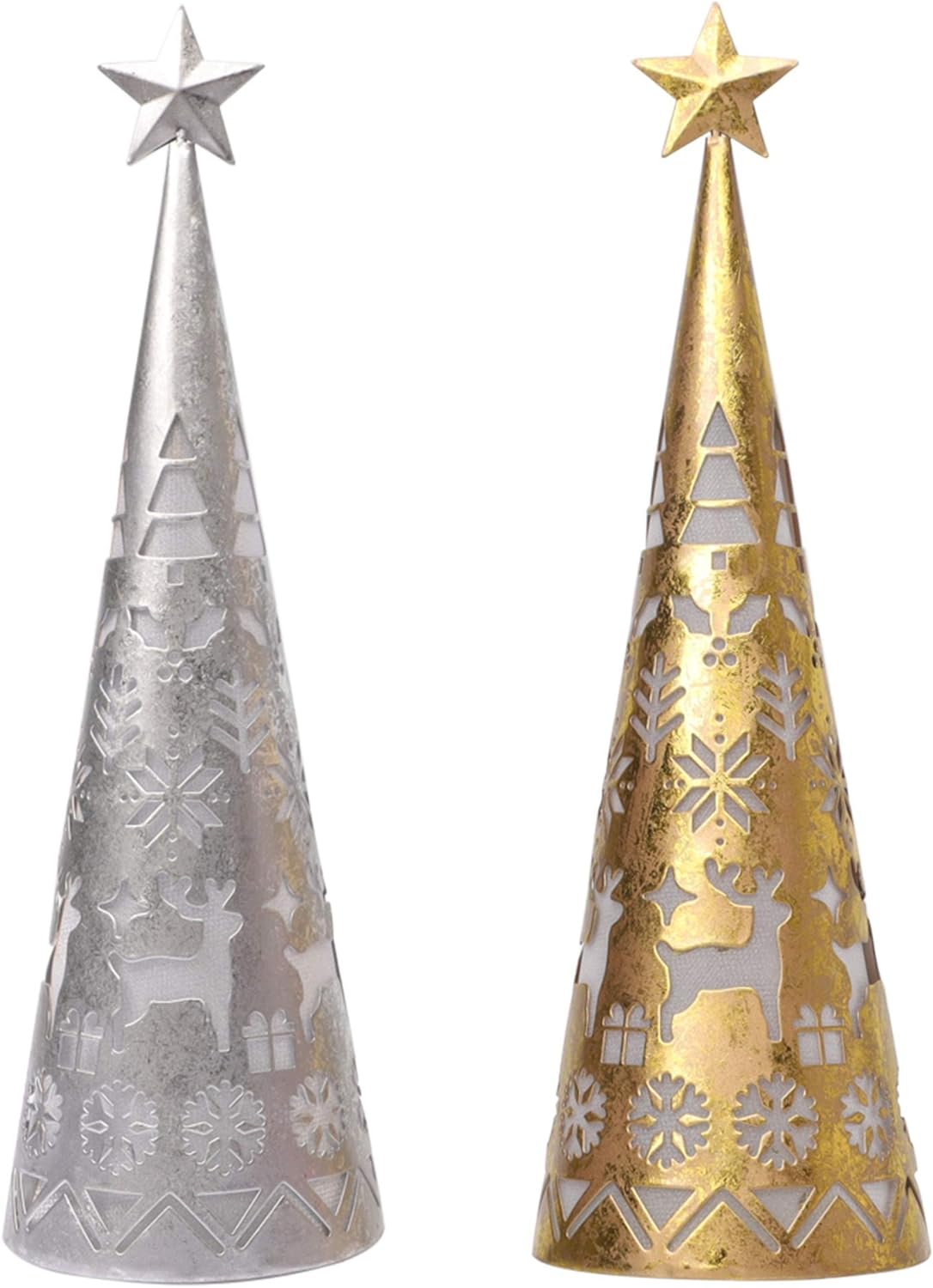 Verhoog de stijl van je feestdecoratie met de ShimmerCone LED Kegel Tafeldecoratie! Deze set van twee kegelvormige decoraties (in goud en zilver), met 10 warme LED-lampjes, voegt een vleugje verfijning toe aan elke kerst, bruiloft of feest. Dankzij de batterijvoeding zijn ze eenvoudig overal binnen te plaatsen, ideaal voor tafels, schoorsteenmantels of bureaus.