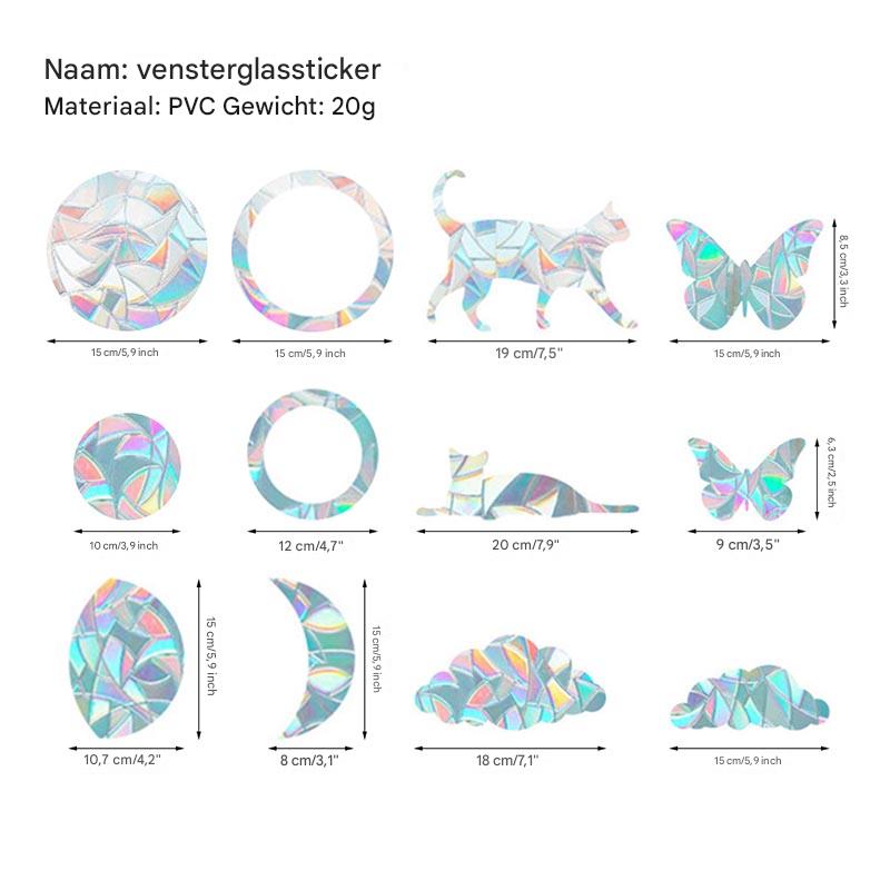 Breng een magisch lichtspel in huis met onze LumiSuncatch Zonvanger Raamstickers. Deze prachtige decoratieve stickers vangen het zonlicht en toveren schitterende regenboogreflecties op je muren en vloeren. Met verschillende vormen en ontwerpen creëer je een dynamisch en uniek lichtspektakel dat gedurende de dag verandert op basis van het weer en de stand van de zon.